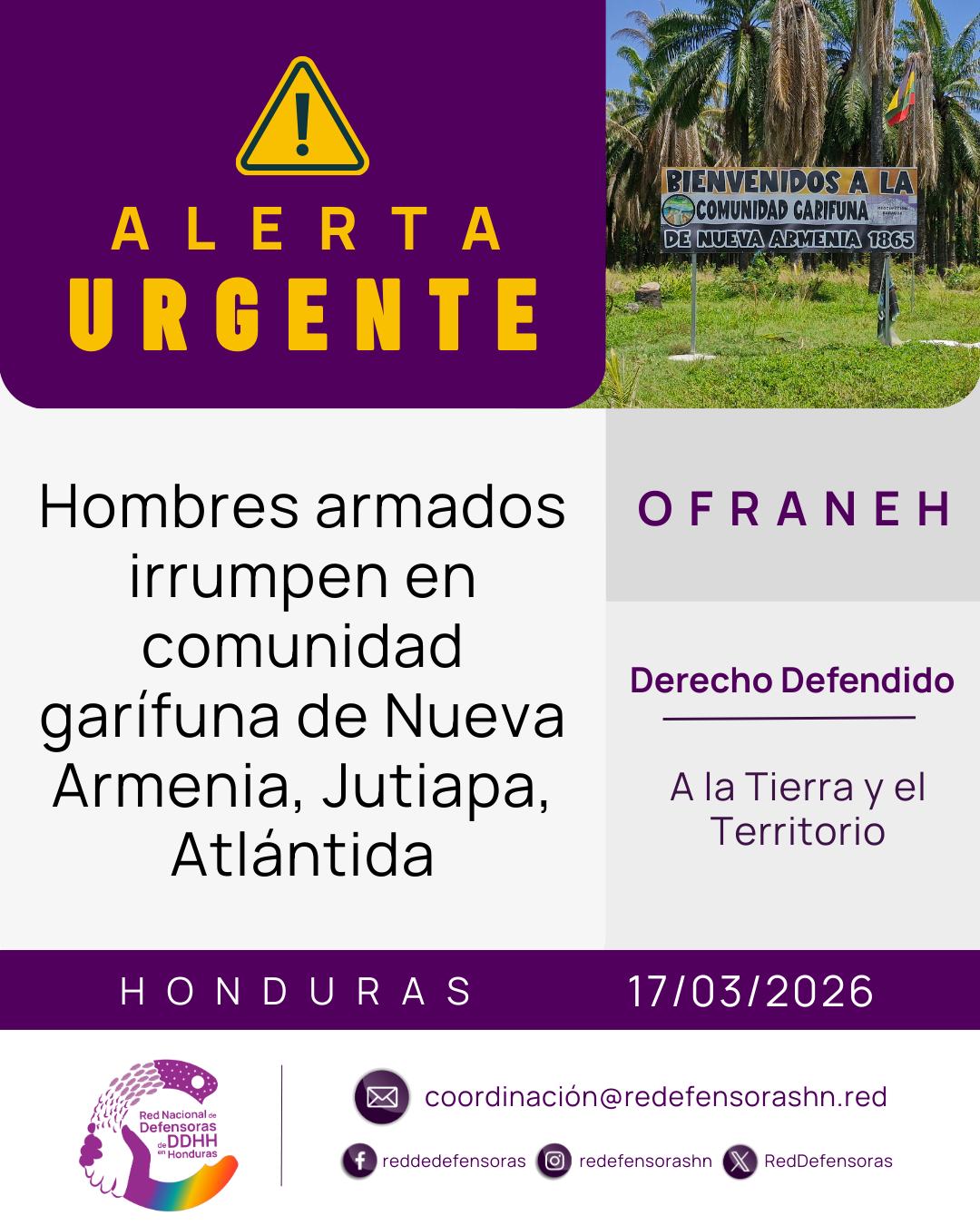Hoy, 17 de marzo de 2026, a las 3:30 p.m., al menos unos 5 hombres armados irrumpieron en la comunidad garífuna de Nueva Armenia, Jutiapa, Atlántida, intimidando y amenazando a los y las defensoras que se encontraban en el lugar.