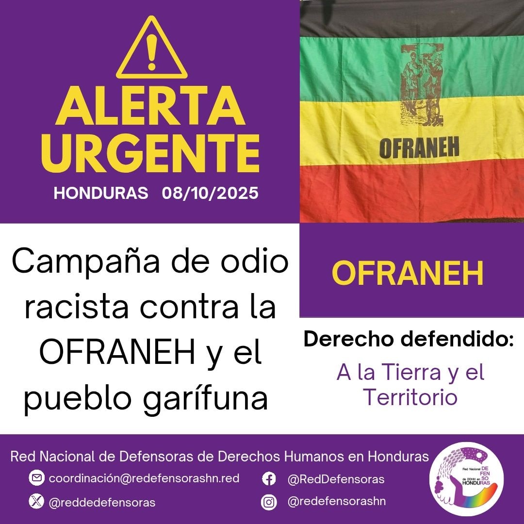 El 7 de octubre de 2025, a través de medios de comunicación corporativos con cobertura nacional se expresaron graves acusaciones en contra de la OFRANEH que ponen en riesgo a las defensoras y defensores del pueblo garífuna.